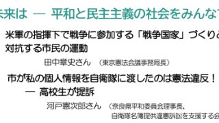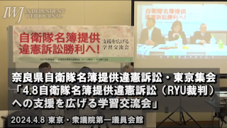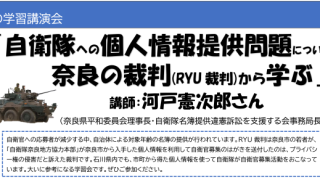 集会 奈良県自衛隊名簿提供違憲訴訟・東京集会「4 8自衛隊名簿提供違憲訴訟(RYU裁判)への支援を広げる学習交流会」 奈良県自衛隊名簿提供違憲訴訟・東京集会「4 8自衛隊名簿提供違憲訴訟(RYU裁判)への支援を広げる学習交流会」YouTubeで、「日本平和委員会、自衛隊名簿提供違憲訴訟」と検索すると、自衛隊名簿提供違憲訴訟勝利へ!支援を広げる学習交流会の動... 2024.07.24 集会