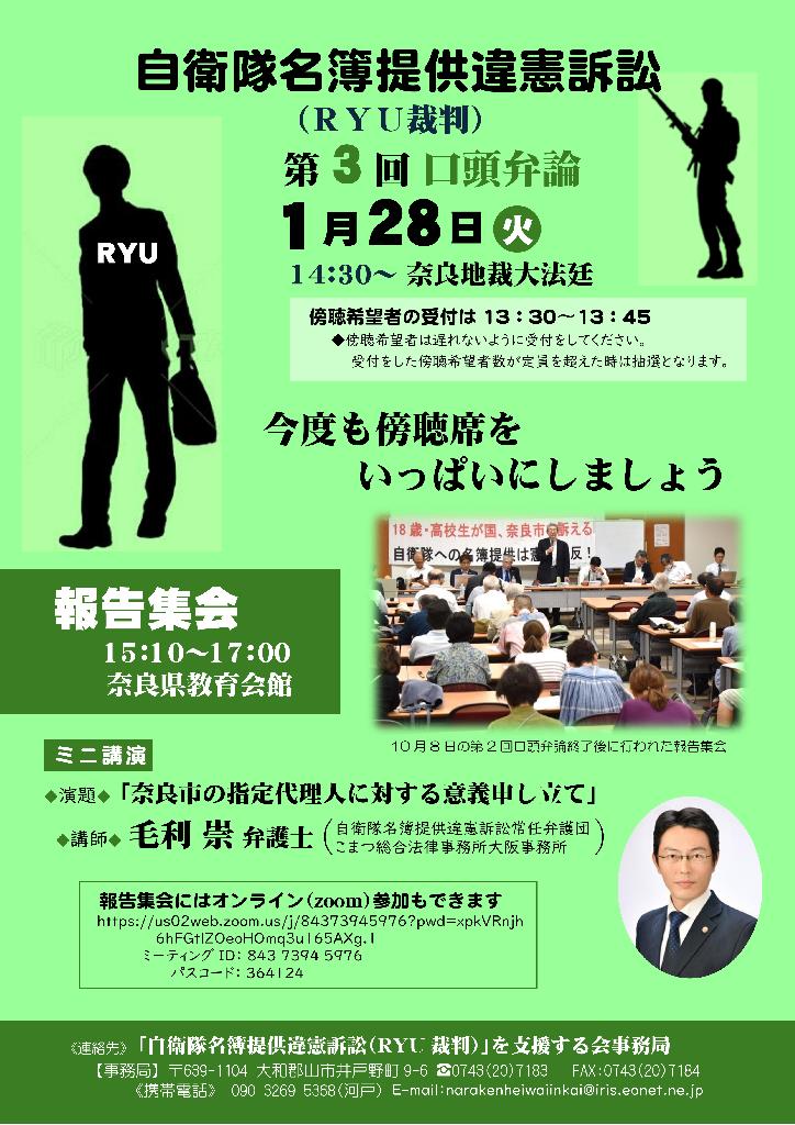 第3回口頭弁論と報告集会 裁判の経過 2025.01.20 自衛隊名簿提供違憲訴訟 第3回口頭弁論 2025年1月28日(火) 14:30~ 奈良地裁大法廷 傍聴希望者受付:13:30~13:45 報告集会 2025年1月28日(火) 15:10~17:00 奈良県教育会館