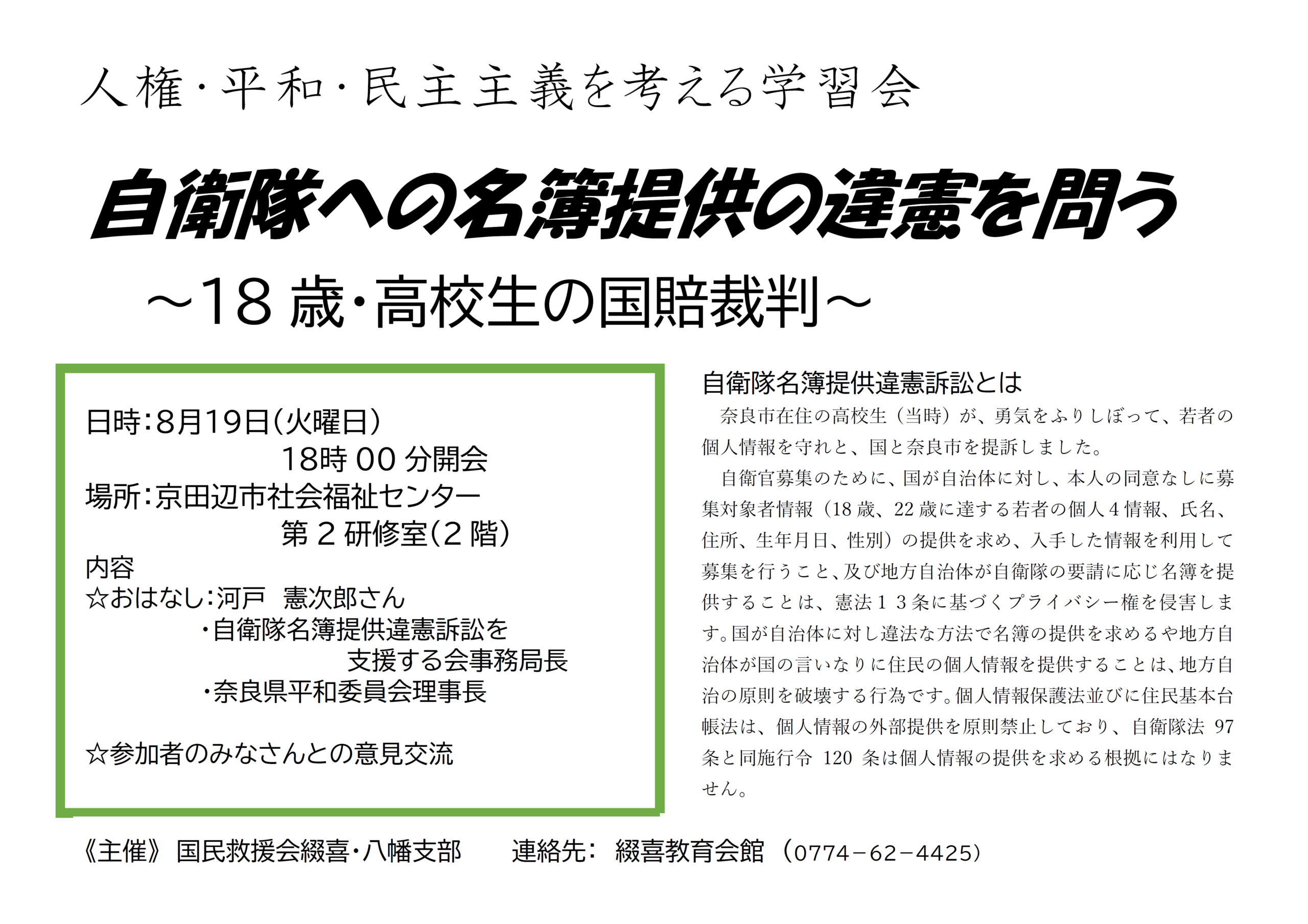 京都府京田辺市 自衛隊への名簿提供の違憲を問う学習会