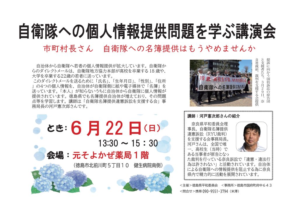 徳島市 自衛隊への個人情報提供問題を学ぶ講演会 集会 2025.05.30 2025年6月22日(日) 13:30~15:30元そよかぜ薬局1階(徳島市北前川町5丁目10 健生病院南側)参加費 無料講師:河戸憲次郎さん